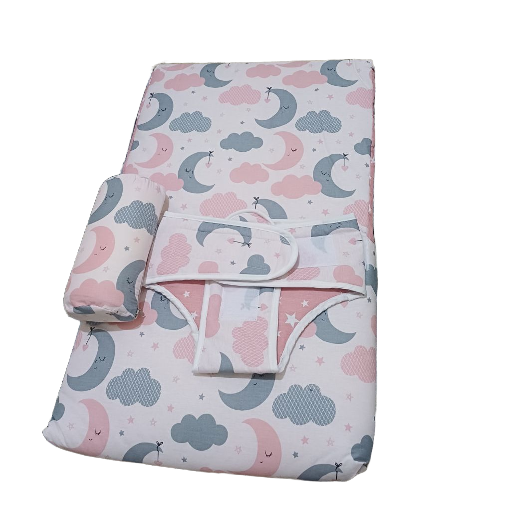 – Tissu 100% coton respirant avec motif lune et nuages (rose/gris)